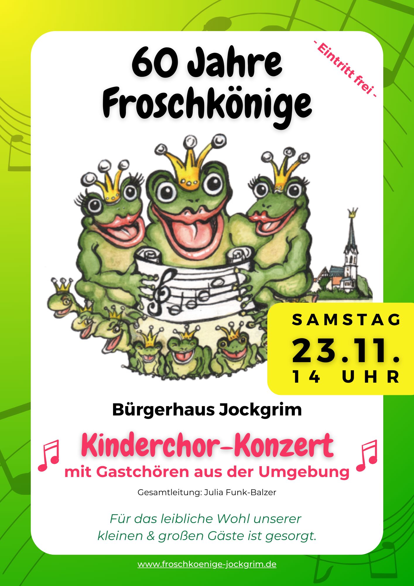 |  | 60 Jahre Froschkönige Kinderchor-Konzert mit Gastchören  Samstag, 23.11.2024, 14 Uhr, Bürgerhaus Jockgrim Gesamtleitung: Julia-Funk Balzer |